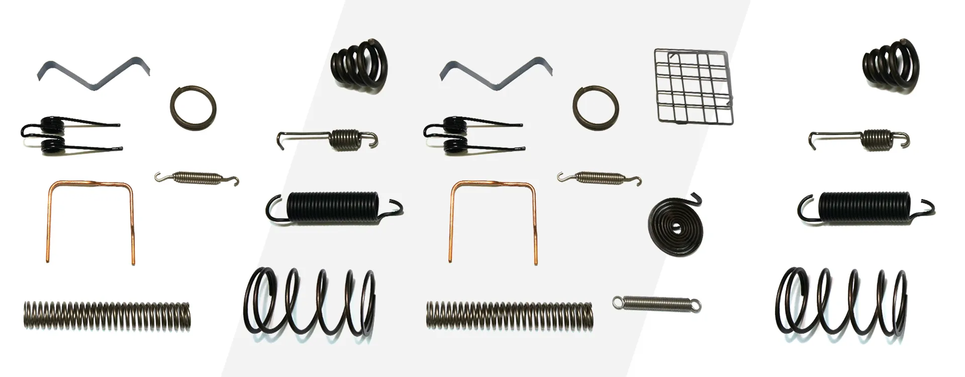 壓縮彈簧、扭簧、電池彈簧、不規則成型彈簧、板簧、汽車水箱夾片、晶體夾捲線器、扣具、拉簧、勾簧製品、散熱器用壓縮彈簧…等等。